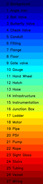 The legend in the figure shows pseudo colors for each of the 28 semantic classes. The classes were chosen by a subject matter expert.