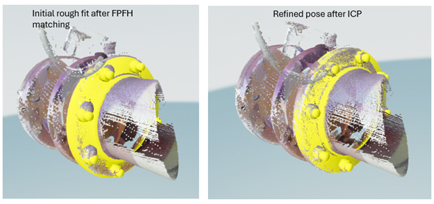 We next identified individual components in the labeled point cloud. I clustered points of a single class, such as a “flange”. I then fit known 3D mesh models to the points. This was done using a conventional process of using RANSAC to match a sparse set of feature points to find a rough pose and then using ICP to refine the pose. The best-fitting model to the data was taken to be the correct component in that location. An example of fitting a flange model is shown below.