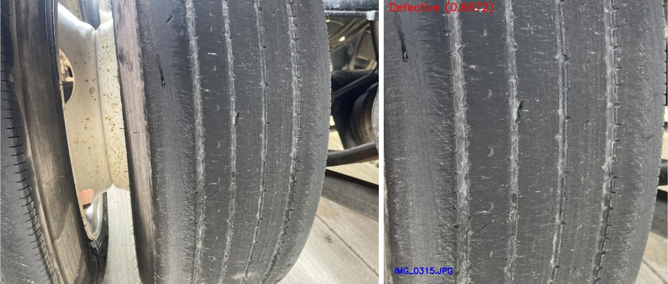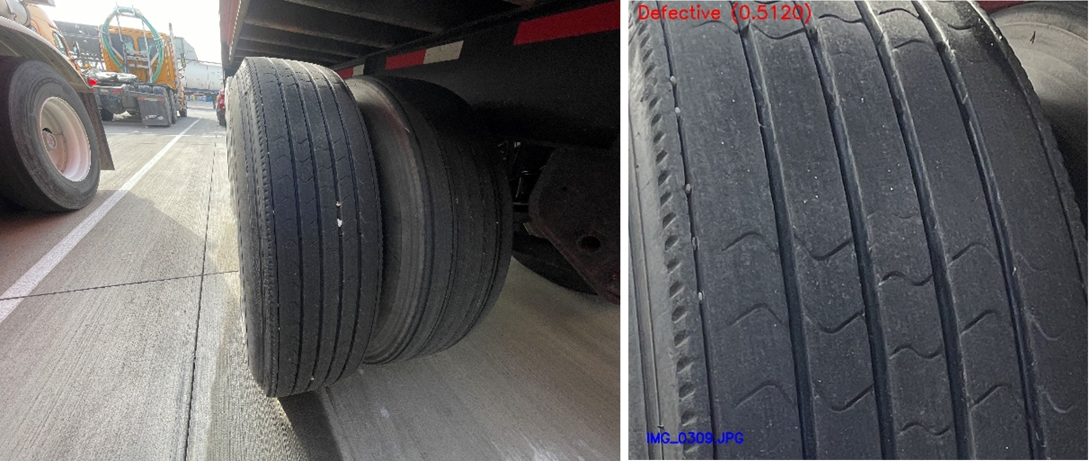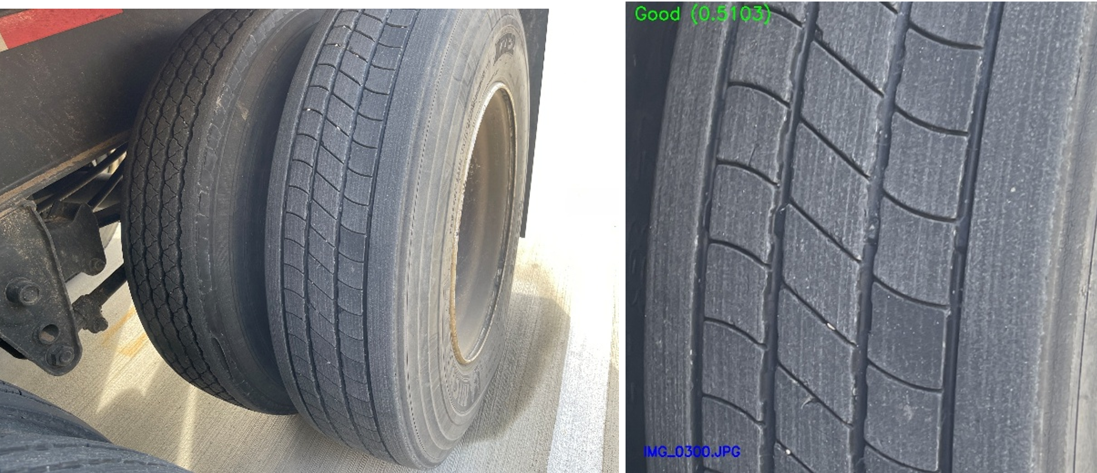 I trained a ResNet50 model to classify each image as “good” or “defective”. The results on a public dataset of tire tread images (“TyreNet”) were 91% accurate. I also applied the system to real images that we captured at a local truck transportation facility. Examples from this data collection are shown below.