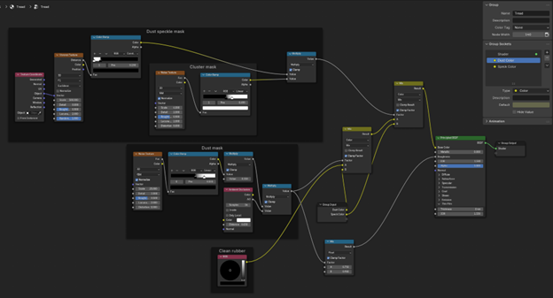 Finally, I detect tire defects in images of the tread. For this initial prototype, I focused on detecting tread defects such as low tread depth, center wear and edge wear. To avoid needing to collect a large dataset of real images of tire defects, I developed a Blender application that rendered synthetic images of tire treads (both good and defective). I randomly varied the tread pattern, lighting, material coloring, and texture. The Blender shader graph to create the tread material is shown below.