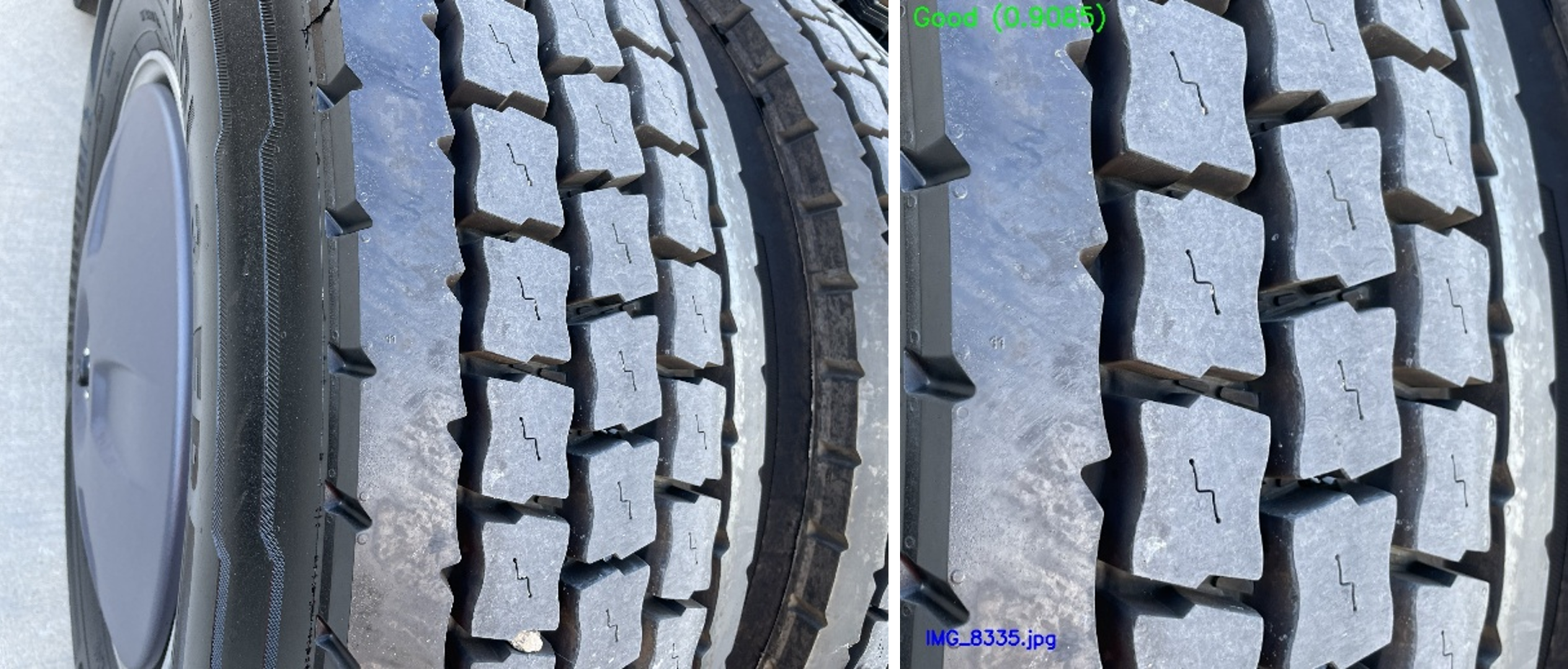The left image of each pair is the original captured image; the right image is a closeup of the tread area that I manually cropped (since the model expects a closeup image of the tread). The classification result is shown as a label on the right image.