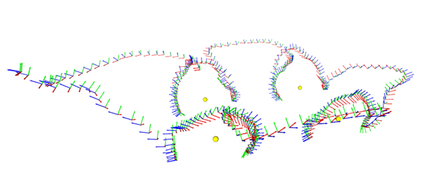 Next, I merge the detections from multiple images to find and label each wheel in 3D. To do this, I needed an estimate of the camera pose in each frame. I used the iPhone app called “CamTrackAR” which captures motion data along with the video data. Using this, I can reconstruct the camera trajectory and the position of each wheel in 3D. The wheels are then identified according to the order that they appear on each side of the vehicle. In the figure below, the yellow spheres represent the detected tire positions.
